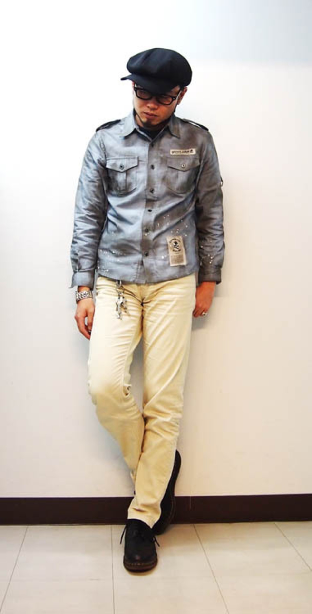 顔料を使って汚し加工しインクを飛ばして見た目をハードなイメージに加工したタイプです。目の粗いシワ感のある風合いの良い生地を使用し、シルエットが綺麗なミリタリーシャツです。フロントに布パッチ袖にD菅がついています。袖裏にはオリジナルクロス柄の生地を使っており腕まくりするとチラッと見える雰囲気の良いアイテムに仕上がっています。