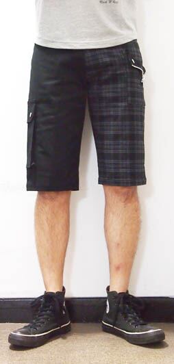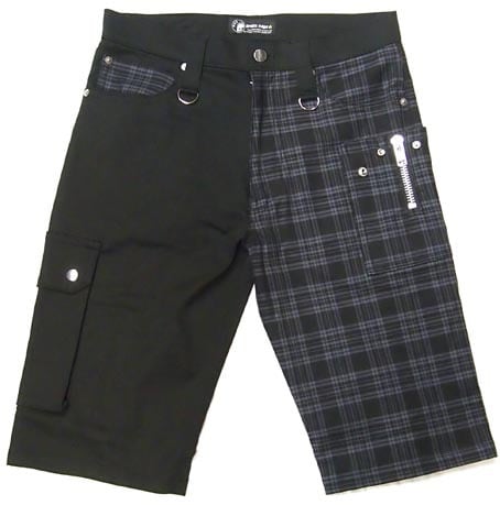 左右非対称な生地でインパクトのあるツートンからーのハーフパンツです。