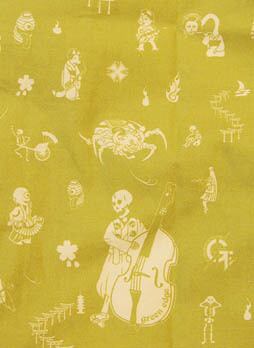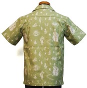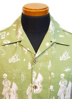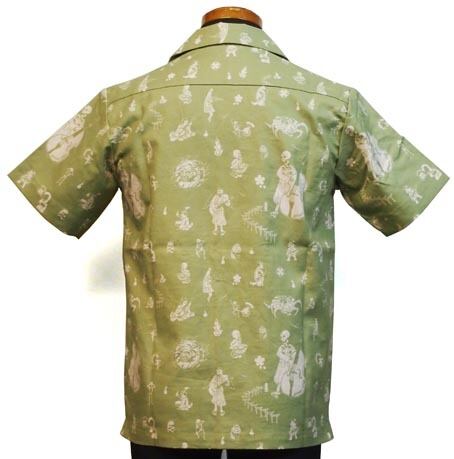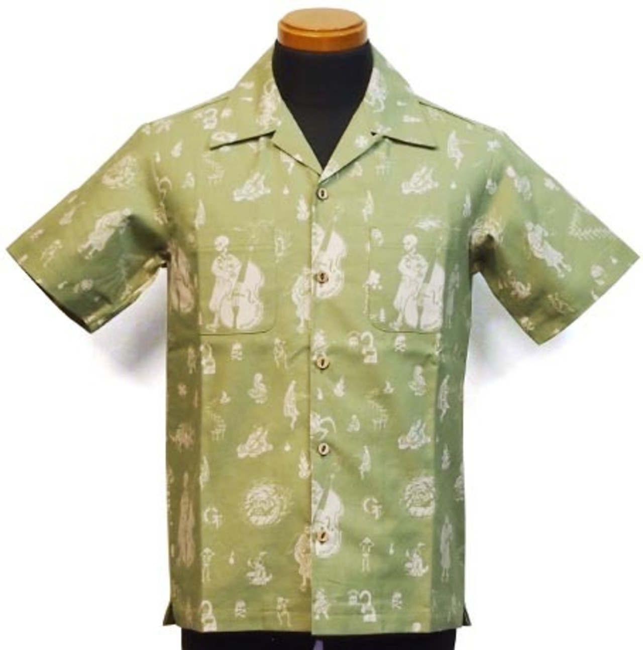 いろんな楽器を持った妖怪をデザインしたオリジナル生地を使用したシャツで形はボーリングシャツの要素を部分的に取り入れシャープな襟やパターンになっています。ボタンはキャッツアイ型のココナッツ風ボタン仕様です。柄ランダムになります。