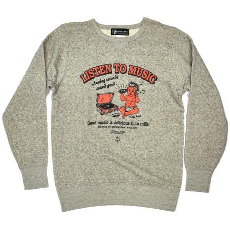 デビルな赤ちゃんとレコードをモチーフにしたデザインをプリントした裏パイルのスエットです。着込むほどに味が出るネオヴィンテージ調のスウェット。