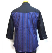 7分袖のシャツで、ストライプと無地の生地を掛け合わせたデザインになっております。袖裏にストライプの生地をしようしており、折り返して着ると違う雰囲気を楽しめます。生地の風合いも着心地の良い素材で長いシーズン着用出来るのでおすすめアイテムです。
