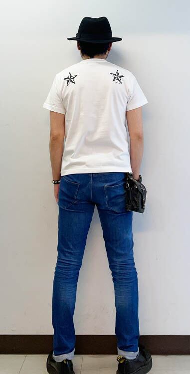 フロントはカレッジ風のデザインのプリントでバックは星を絶妙な位置にプリントしたTシャツです。バックのプリントは肩掛けカバンなどを着用した時にも雰囲気が出るような作りにしています。
